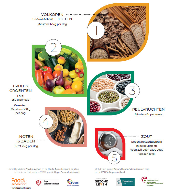 De Hoge Gezondheidsraad publiceerde in 2019 een rapport om de Belgische bevolking op het gezonde pad te krijgen. Terwijl de vorige aanbevelingen uit 2016 vooral focusten op de noodzakelijke voedingsstoffen voor ons lichaam, gaan deze nieuwere aanbevelingen dieper in op het verband tussen voeding en gezondheid. Ze zijn zeer praktisch en prioriteir gerankt naar het effect op onze gezondheid.
