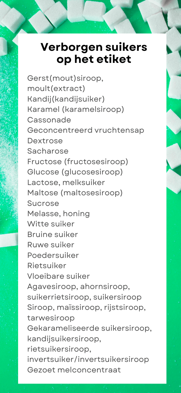 Weten wat je mag eten is goed... Maar je moet wel weten hoeveel suiker er echt in een voedingsmiddel zit! Dit is niet altijd gemakkelijk, aangezien toegevoegde suikers vaak verborgen zijn en niet als zodanig op het etiket vermeld staan. Je kan leren de ingrediënten te ontcijferen. De onderstaande lijst kan je helpen de verschillende termen te herkennen die naar suiker verwijzen: