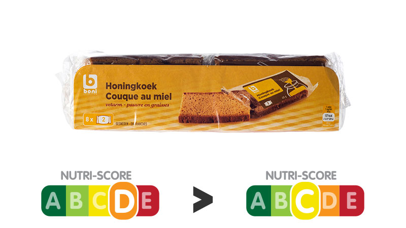 Een meer dan opmerkelijke ontwikkeling. De A is te danken aan een vermindering van de hoeveelheid suiker: 4 g minder per 100 g.