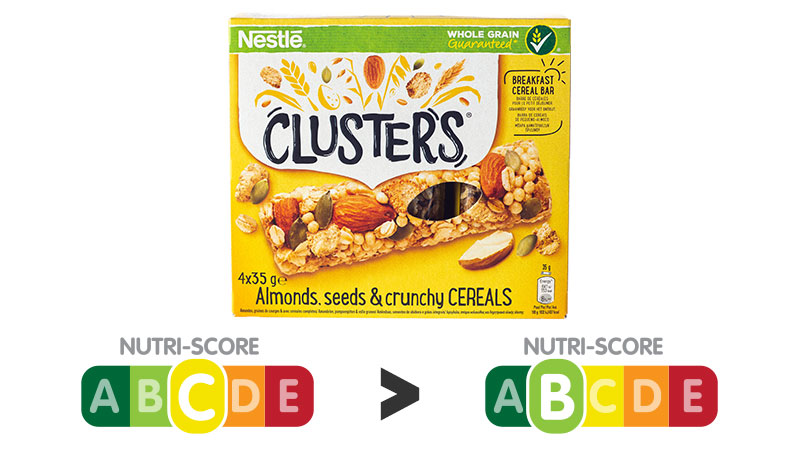 Hier zijn vier voorbeelden van snacks en zes van ontbijtgranen waarvan de Nutri-Score is gestegen dankzij veranderingen in het recept.