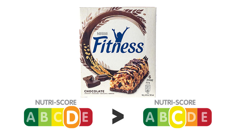 Deze repen bevatten momenteel minder suiker en zout, en krijgen daarom een C. Er zitten ook iets meer vezels en proteïnen en minder energie en verzadigde vetten in.