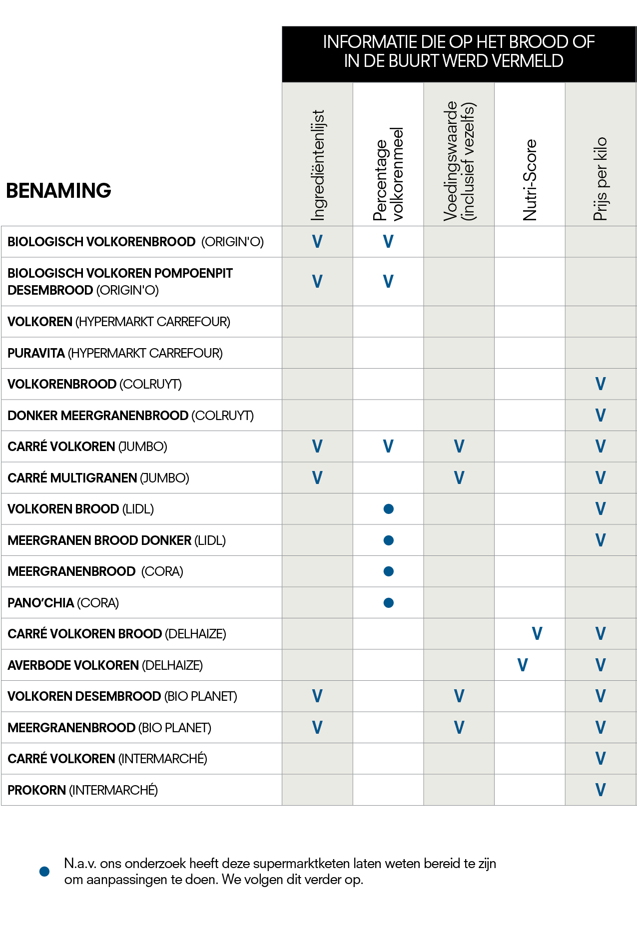 Op het vlak van informatie bleven we met lege handen achter. Zo troffen we zelden een ingrediëntenlijst aan en/of een aanduiding van de gebruikte granen. Bakkerijen toonden bij slechts 8 op de 64 broden een duidelijke lijst met gebruikte granen. We waren teleurgesteld over de gebrekkige aanduiding van ingrediënten in broodjeszaken. Supermarkten verstrekken iets betere informatie met een aanduiding van de gebruikte granen of een volledige ingrediëntenlijst. Carrefour, Colruyt, Cora en Delhaize vermelden ingrediëntenlijsten online, maar het percentage volkorenmeel is daarbij niet altijd duidelijk.