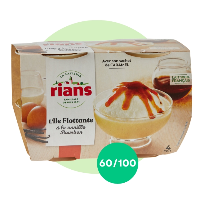 Terug naar bovenHoewel het merk Rians ook in de lijst van de slechtste crèmes stond, is het de vanille Bourbon île flottante van ditzelfde merk die als winnaar uit de test komt. Deze crème behaalt een gezondheidsscore van 60/100.
