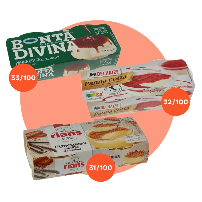 De Bonta Divina karamel panna cotta, de Delhaize framboos panna cotta, en de romige vanille en speculoos van Rians eindigen als laatste in onze ranglijst. Elk van deze producten bevat zowel additieven als ultrabewerkte ingrediënten. Wat de voedingswaarden betreft, is het ook niet beter: ze hebben allemaal een Nutri-Score D.