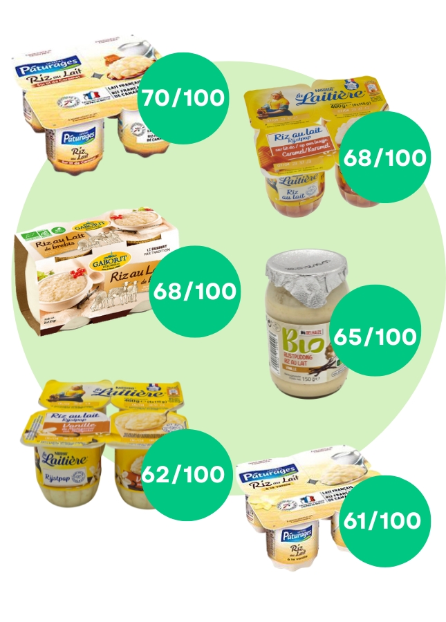 Wat betreft additieven en ultrabewerkte ingrediënten zijn de producten met een label aanvaardbaar: de karamel rijstpap van Pâturages (Intermarché), de rijstpap op een laagje karamel van La Laitière en de schapenmelk rijstpap van Gaborit bevatten geen additieven.