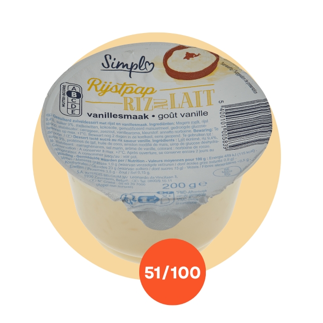 Het product dat als laatste eindigt in onze test is de Rijstpap vanillesmaak van het merk Simpl (Carrefour). Op de verpakking staat een Nutri-Score B, maar de nieuwe berekeningswijze wordt door de fabrikant nog niet toegepast. Uit onze berekening blijkt dat deze rijstpap in werkelijkheid een (nieuwe) Nutri-Score C heeft.