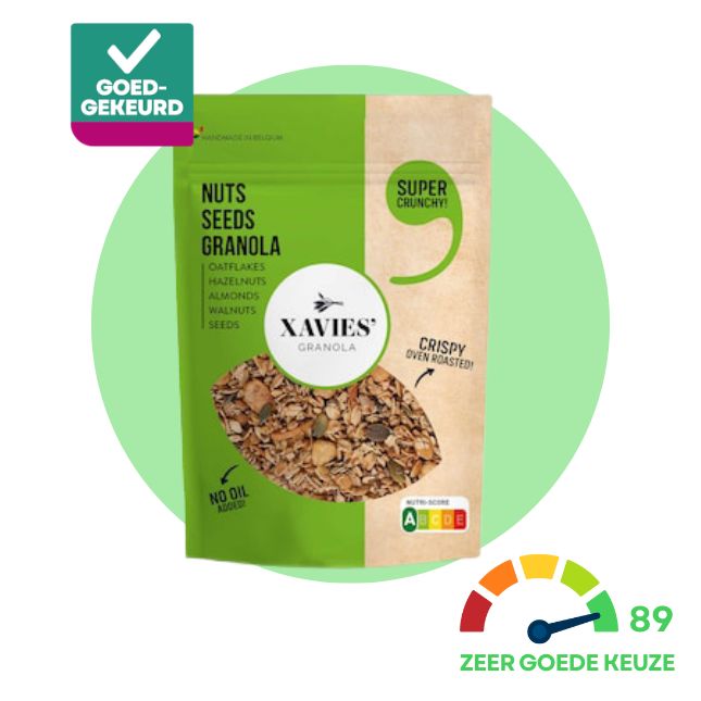 De Nutri-Score is een interessant hulpmiddel om binnen eenzelfde productcategorie een gezonde(re) keuze te maken. De score houdt rekening met gunstige parameters (vezels, eiwitten, fruit, groenten, noten, koolzaad, olijf- en notenolie) en te beperken parameters (kilocalorieën, verzadigde vetzuren, suikers, zout en zoetstoffen), en komt zo tot een algemene beoordeling van de voedingswaarde van een product. Om te weten hoe je de beste granola kiest, volg je het advies van onze experts in onze koopgids.