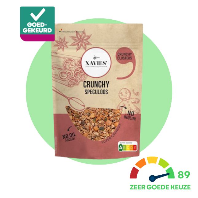 Op het eerste gezicht zou je denken dat deze speculoosgranola minder gezond is dan andere varianten. Toch haalt hij een heel goede score in onze test. De fabrikant heeft er namelijk geen verkruimelde speculooskoekjes in verwerkt, maar wel speculooskruiden. Daardoor krijgt het product zonder moeite een Nutri-Score A.