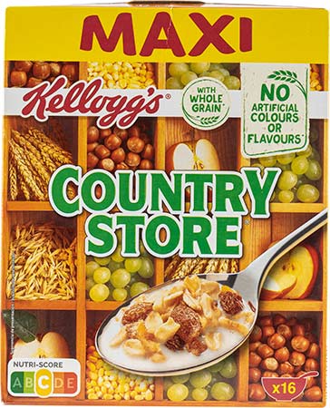 Country Store van Kellogg's bevat 8,5% rozijnen, en amper 1% gedroogde appels en 1% noten per 100g.