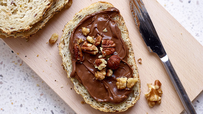 Smeer wat chocoladepasta op een sneetje volkoren brood en bedek het met een mengeling van grof gehakte noten. Als gezonder alternatief kun je het sneetje brood vervangen door een halve banaan die je in de lengte doorsnijdt. Verder kun je ook proberen je eigen chocoladepasta te maken op basis van noten. Op het internet vind je tal van recepten.