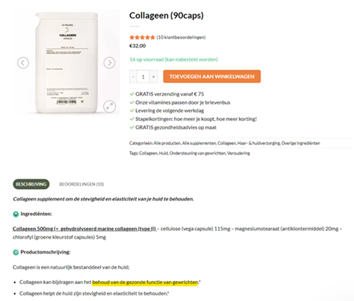 Gezondheidsclaims als “goed voor gewrichten” en “hydraterend” mogen ook helemaal niet zomaar gebruikt worden. Er zijn regels rond, zo moet de Europese Commissie de toelating geven. Voor collageen is dat helemaal niet gebeurd, maar sommige fabrikanten trekken zich daar niets van aan en vermelden het toch.
