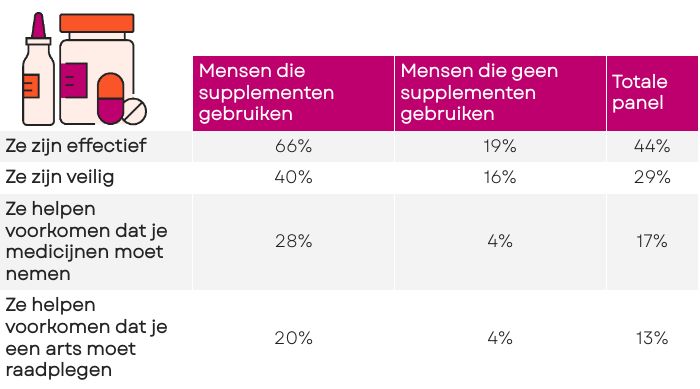 66% van de mensen die ze gebruiken denkt dat ze goed werken, hoewel het geweten is dat supplementen enkel bij tekorten echt effectief zijn. En hoewel 40% van hen ze nog steeds als veilig beschouwt, denkt 70% ook dat ze bijwerkingen kunnen hebben en 49% vindt dat ze moeten worden ingenomen onder toezicht van een gezondheidsdeskundige. Er heerst dus wat verwarring over de effectiviteit en veiligheid van de middelen. Bijna 8 op de 10 mensen die ze niet gebruiken, vinden dat ze enkel op medisch advies mogen worden ingenomen.