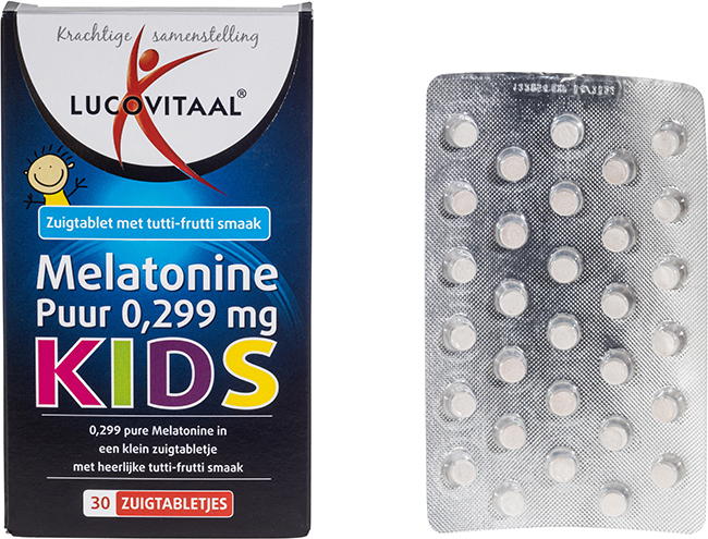 Hieronder heb je voorbeelden van producten met enkel melatonine als actief bestanddeel. Ze bevatten minder dan 300 mg melatonine (of 200 microgram in geval van smelttabletten), maar bestaan in verschillende vormen: o.a. druppels, smelttabletten of tabletten. De vorm kan ook een invloed hebben op de effectieve actieve dosis in het lichaam:- Lucovitaal melatonine puur KIDS 0,299 mg met tutti-frutti smaak 30 zuigtabletten (Kruidvat en H&B)