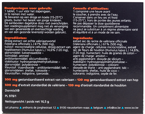 Bevat gestandaardiseerd extracten van 500 mg valeriaan en hop 120 mg.