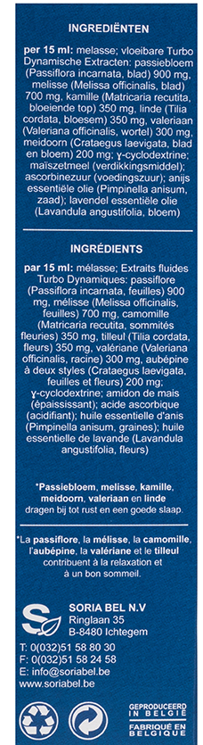 Bestaat uit plantenextracten (passiebloem, citroenmelisse, haver, valeriaan en hop) en essentiële olie (hop en citroenmelisse). De aanwezigheid van essentiële oliën is niet vermeld op het etiket, omwille van een zeer lage concentratie, maar wel aanwezig. Enkel maar leesbaar in de bijsluiter.