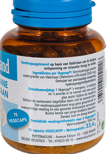 350 mg gestandaardiseerd valeriaanextract met 2,8mg valeriaanzuur (0,8% valeriaanzuur)