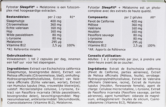Dagdosering is per twee tabletten. Slaapmutsje, citroenmelisse, valeriaan, hop, wilde passiebloem, L-tyrosine, melatonine en vitamine B12.