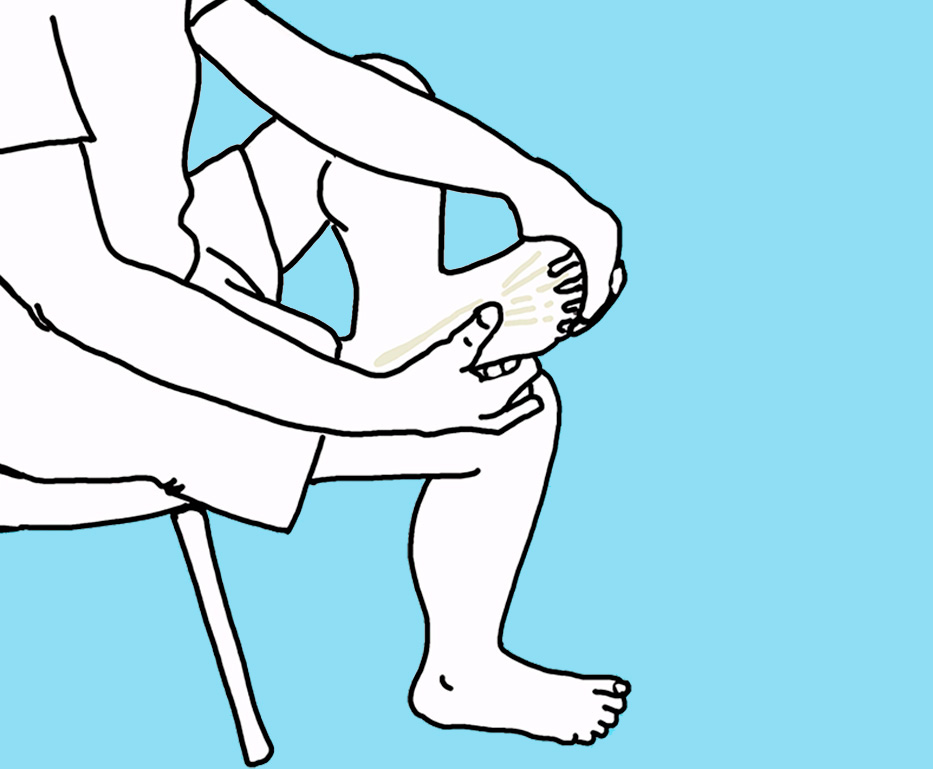 1. In zithouding leg je je pijnlijke voet op de dij van het andere been. Plaats de vingers van je hand (die aan de kant van de pijnlijke voet) net onder de basis van de tenen (aan de kant van de voetzool) en trek deze in de richting van het scheenbeen, totdat je rek in de voetboog voelt.