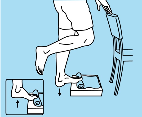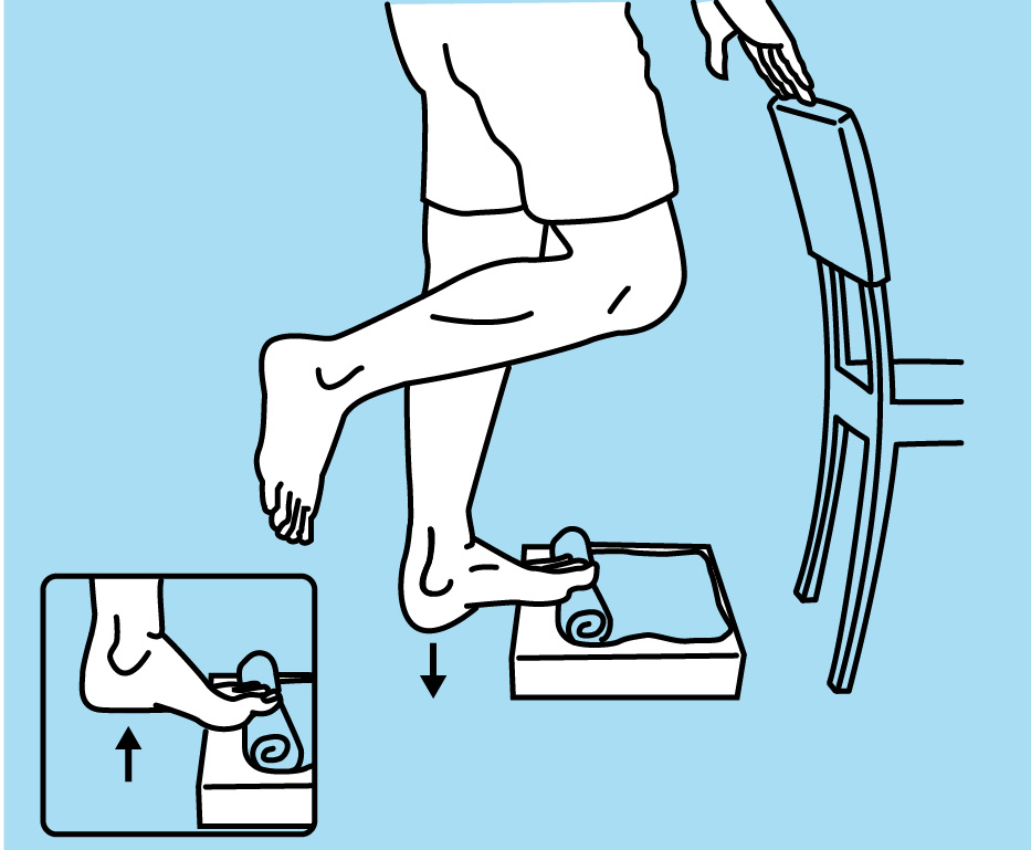 Ga op 1 voet op een trede of een platform staan, plaats een opgerolde handdoek onder je tenen. Til je hiel op in 3 seconden en ga weer naar beneden in 3 seconden. Pauzeer tussen het optillen en het afdalen.