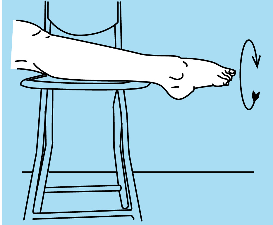 Met een been op een stoel, buig je voet naar voren. Maak cirkels met je voet door je enkel te draaien.