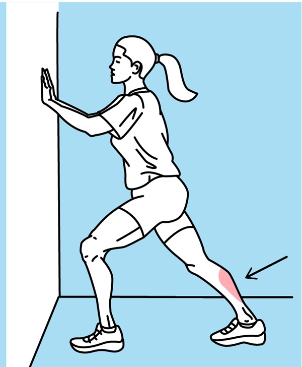 Ga rechtstaan met je handpalmen tegen de muur met je voeten naar voren wijzend. Plaats je pijnlijke voet achter de andere. Hou je achterste been gestrekt en je voorste been gebogen. Leun naar voren tot je rek in de kuit van het achterste been voelt.