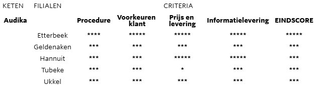 In onze tabellen geven we per filiaal onze criteria en de resultaten weer. Of de juiste procedure werd gevolgd voor de opmeting en de kwaliteitscontrole weegt het zwaarst door op de eindscore (20 van de 40 punten). Of de verkopers voldoende rekening hielden met de wensen van de klant (8 van de 40 punten), hoeveel informatie er werd gegeven over de levertermijn en de prijs (6 van de 40 punten) en de algemene informatieverlening (6 van de 40 punten) telden iets minder mee.