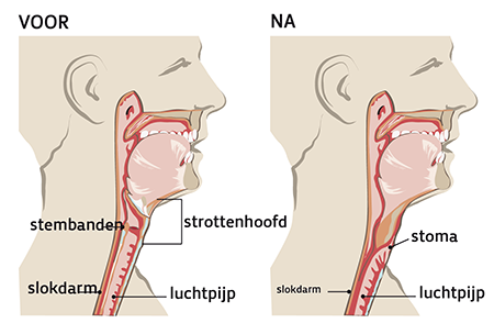 Doordat de luchtpijp niet langer verbonden is met het strottenhoofd, verliest hij bovendien zijn stem. Die handicap is heel moeilijk te verteren, zowel op lichamelijk als op psychologisch en sociaal vlak. De patiënt kan plots niet meer normaal communiceren en riskeert zo in een isolement terecht te komen. Maar met specifieke ademhalings-, slik- en luchtbeheersingstechnieken kan hij doorgaans na enkele maanden oefenen toch weer leren spreken, zij het anders dan vroeger.