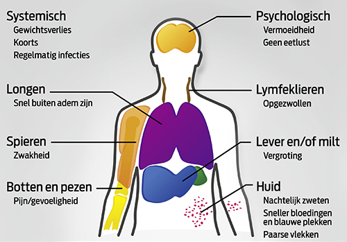 Leukemie veroorzaakt erg algemene, vage symptomen. Die kunnen variëren naargelang van de vorm van de ziekte. Doordat kwaadaardige, onvolgroeide witte bloedcellen (blasten) gaan woekeren in het beenmerg, beletten ze de groei van normale witte en rode bloedcellen. Zo verstoren ze de normale werking van de bloedcellen. De weerstand verzwakt en er zijn minder rode bloedcellen beschikbaar voor zuurstoftransport, wat onder meer leidt tot vermoeidheid. Het lage gehalte aan bloedplaatjes veroorzaakt dan weer sneller blauwe plekken.