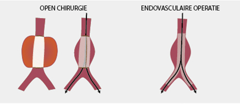 Het opereren van een aneurysma kan op twee manieren gebeuren. De eerste techniek is open chirurgie. De chirurg maakt een grote snede in de buik, vervangt het deel van de slagader dat door het aneurysma is beschadigd door een aortaprothese (een kunststof buisje) en naait die vast. De prothese wordt bedekt met de wanden van de slagader. Dit duurt vier tot zes uur en doorgaans kunnen de patiënten na vier tot zeven dagen naar huis. Na circa vier weken kunnen ze hun normale activiteiten hervatten. Bij de meer recente (endovasculaire) operatietechniek wordt de buik niet geopend. Een gecomprimeerde prothese wordt in de slagader ingebracht – meestal via de lies – en met behulp van een katheter tot aan het aneurysma gebracht. Eenmaal op de juiste plaats, wordt de prothese opengevouwen. Ze wordt niet vastgenaaid. Na de ingreep stroomt het bloed door de prothese, waardoor de verzwakte slagaderwanden worden ontzien.