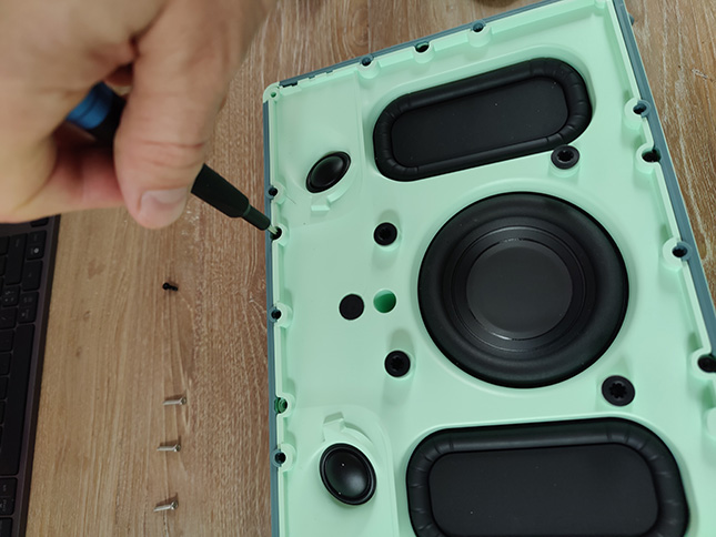We wilden weten of de speaker inderdaad makkelijk te repareren is. Met de handleiding bij de hand gingen we aan de slag met een inbussleutel nr. 3 en een PH1 kruiskopschroevendraaier. Daarmee konden we de bovenplaat met de luidspreker losmaken van de rest van de behuizing. Belangrijk: vergeet de langere schroef in het midden niet!