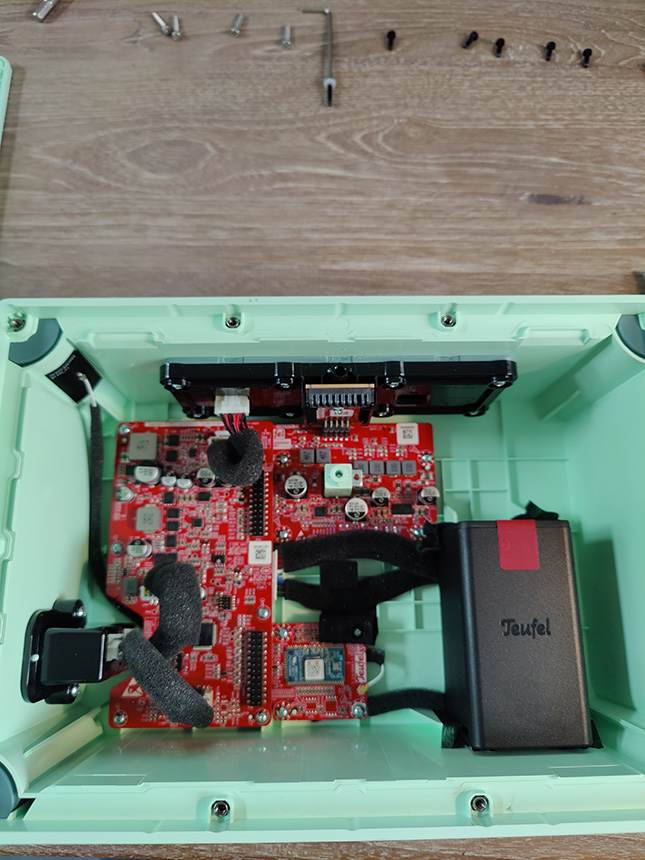 Bij de Teufel MYND, die €249,99 kost, is het concept wél volledig doordacht en gebruiksvriendelijk uitgewerkt. Reparatie en aanpassingen zijn eenvoudig. De ontwerpers hebben duidelijk nagedacht over de bekabeling, zodat die niet per ongeluk beschadigd raakt. Alle connectoren zijn klikbaar en niet vastgesoldeerd, en de bluetooth-module is losgekoppeld van het moederbord. Dat betekent dat je individuele onderdelen kunt vervangen, zonder meteen het hele bord te moeten vervangen.