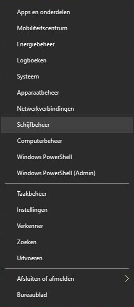 - Klik in Windows met de rechtermuisknop op het Windows-pictogram en kies Schijfbeheer.