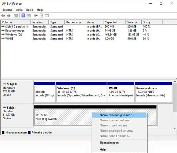 - In het venster zie je bovenaan de lijst met schijven en onderaan de details van hun inhoud. Hier verschijnt je externe SSD die nog niet is geïnitialiseerd (bijvoorbeeld: "Schijf 1"). Raadpleeg de handleiding van de SSD voor informatie over het initialiseren.