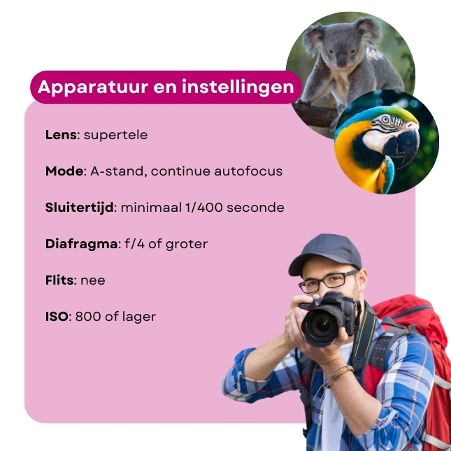 "Als je geen spiegelreflexcamera hebt, is een compacte camera met een krachtige zoom voldoende. Denk aan superzoomcamera's met 20x of zelfs 80x optische zoom. Om dieren van een afstand te fotograferen, heb je minstens 8x optische zoom nodig. Het beste moment om te fotograferen is vroeg in de ochtend en in de late namiddag, wanneer het licht het beste is en de dieren zich het meest op hun gemak voelen," legt hij uit.