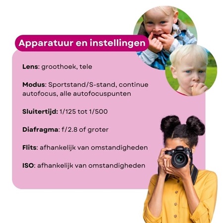Kinderen worden zowel binnen als buiten gefotografeerd. Je kunt verschillende camera's en lenzen gebruiken.