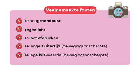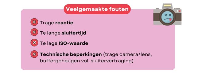 Om bewegingsonscherpte te voorkomen, kies je voor een korte belichtingstijd met bijvoorbeeld de sport- of S-modus of de burst-modus. Aarzel niet om de sluiter meerdere keren achter elkaar te laten afgaan, want dit vergroot de kans op een goede foto.