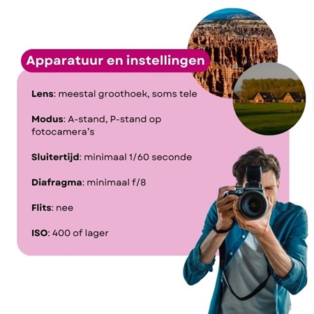 Wat de instellingen betreft, kies je een klein diafragma, zoals f/8 of meer.