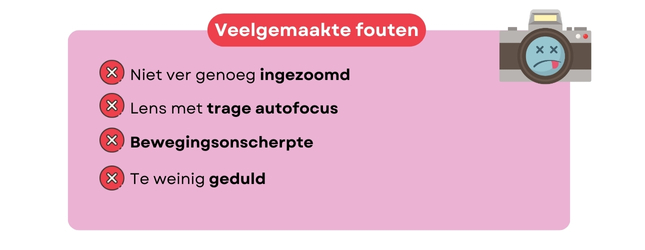 Je moet ook het buffergeheugen van je camera in de gaten houden. Als het vol is, kun je (bijna) geen foto's meer maken. Aarzel niet om een snelle geheugenkaart te kopen. Daarop kun je je foto's opslaan en het buffergeheugen van je camera ontlasten, zodat je kunt blijven fotograferen.