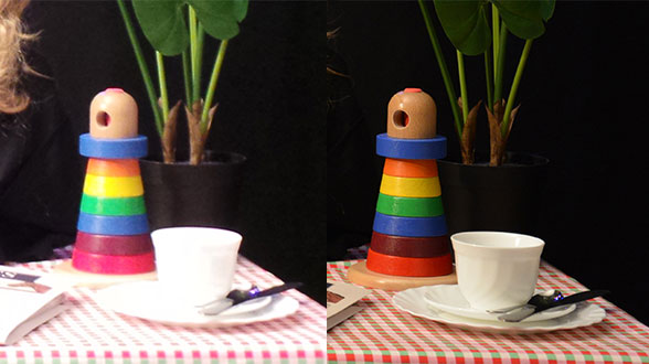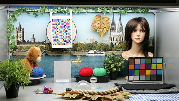 Deze foto’s tonen maar een deel van de testscène die het labo gebruikt om de kwaliteit van portretfoto’s te beoordelen. De kleurweergave is duidelijk heel verschillend: op de linkse foto heeft de huid een mooie en natuurlijke kleur, terwijl ze op de rechtse niet mooi oogt en overbelicht is. Bovendien is de linkse foto scherper en gedetailleerder. Beide foto’s worden telkens in exact dezelfde omstandigheden gemaakt: de belichting en de testscène zijn identiek om verschillende toestellen te kunnen vergelijken.