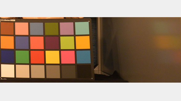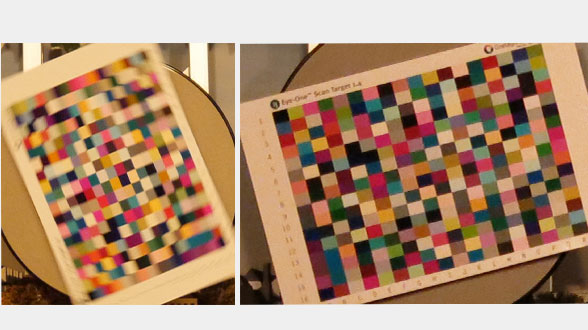 Om de kwaliteit van foto’s bij weinig licht te beoordelen, gebruiken we ook een kleurenkaartje dat aan een opstaande draaischijf is bevestigd. Vervolgens laten we deze kleurenkaart ronddraaien terwijl we foto’s maken. Dit is een zware uitdaging voor de toestellen, omdat de foto’s niet alleen wazig kunnen worden door te weinig licht, maar ook door het bewegende onderwerp. Deze test stelt ons dan ook in staat om de goede van de slechte toestellen te onderscheiden.