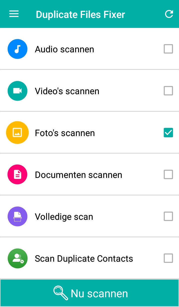 Je kunt de app al je bestanden laten scannen op dubbels (Volledige scan) of per type bestand. Wij kiezen hier Foto’s scannen. Klik op Nu scannen. De app vraagt toestemming tot foto’s, media en bestanden op je toestel. Klik op Toestaan.