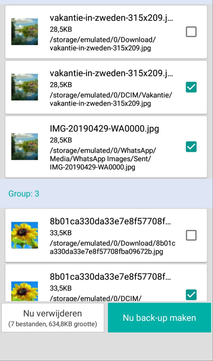 Eens de scan is voltooid krijg je een overzicht te zien van alle foto’s waarvan duplicaten op je toestel staan. Er komt automatisch een vinkje te staan naast de duplicaten. De niet geselecteerde foto’s zullen op je smartphone blijven staan.
