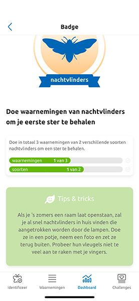Je vindt in deze app ook uitdagingen en badges voor behaalde waarnemingen.