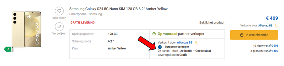 Een goed voorbeeld van deze onduidelijkheid vonden we bij een zoekopdracht naar een "Samsung Galaxy S24 128GB refurbished" op Fnac.be: de resultaten tonen tweedehands toestellen. Het onderscheid tussen tweedehands en refurbished wordt niet duidelijk gemaakt, wat tot verwarring bij de consument kan leiden.