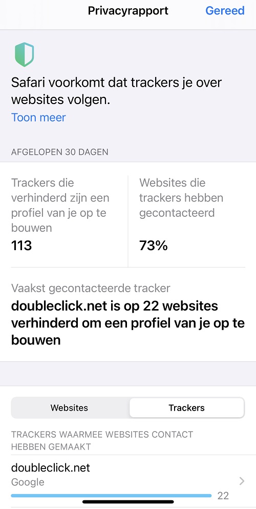 Het rapport wordt geopend en je kunt het aantal trackers zien dat Safari de afgelopen 30 dagen heeft kunnen neutraliseren. Het is verre van feilloos maar het is een eenvoudige manier om je tracking op het internet te beperken. Raadpleeg de lijst van de websites en druk op elke website om na te gaan welke trackers geblokkeerd werden.