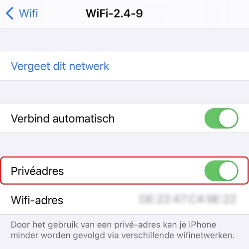 Bij Instellingen > Wifi druk je op het wifinetwerk waarmee je momenteel verbonden bent, en ga je na of de optie Privéadres geactiveerd is. Dit is een extra beveiliging om tracking van je iPhone in te perken door zijn MAC-adres ("wifi-adres" genoemd in dit menu) op het netwerk te wijzigen.