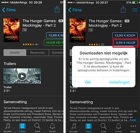 Opgelet! Het is belangrijk dat u huurt en niet koopt. Bij huren zal uw iPhone de film onmiddellijk proberen te downloaden, wat niet lukt, waardoor u ook niet betaalt. Koopt u de film daarentegen, dan zal de download pas starten van zodra er voldoende ruimte beschikbaar is. U betaalt dan wel meteen.