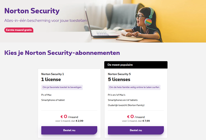 Kijken we bijvoorbeeld naar Proximus. Deze operator biedt als oplossing Norton Security aan voor €35,88 (€32,89 met een maand gratis) per jaar terwijl je via de site van het merk Norton €29,99 betaalt.