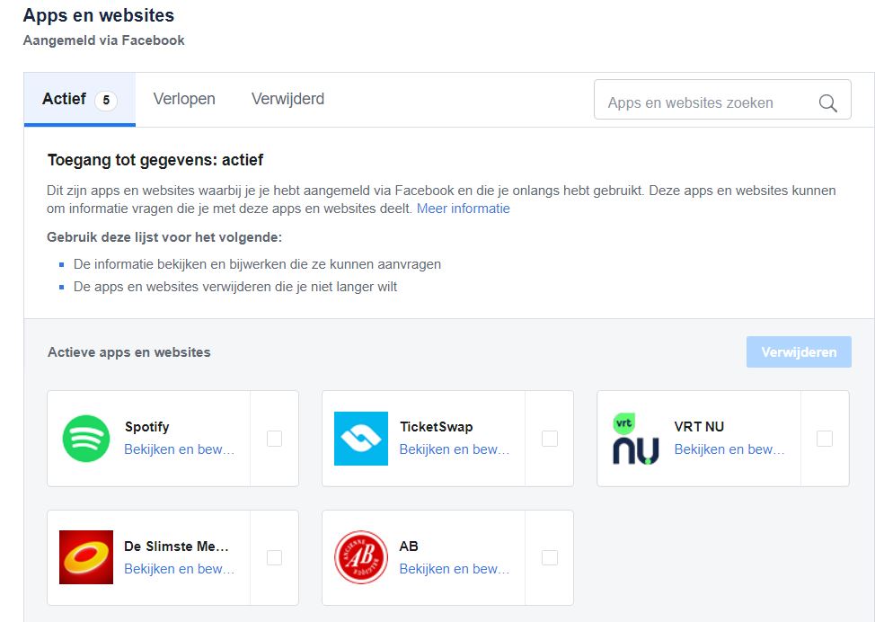 Je kan die toegang echter controleren. Eens je bent aangemeld op je Facebook-account, klik je op het kleine pijltje rechtsboven en dan op Instellingen > Apps en websites. De apps die je hebt geïnstalleerd komen in de lijst "Actieve apps en websites" te staan. Je kunt hier eenvoudig controleren tot welke gegevens de apps of websites toegang hebben en ze verwijderen.