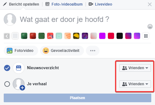 Wanneer je een bericht plaatst, zie je het privacyniveau rechts onder aan het venster. Zorg ervoor dat hier altijd Vrienden staat.